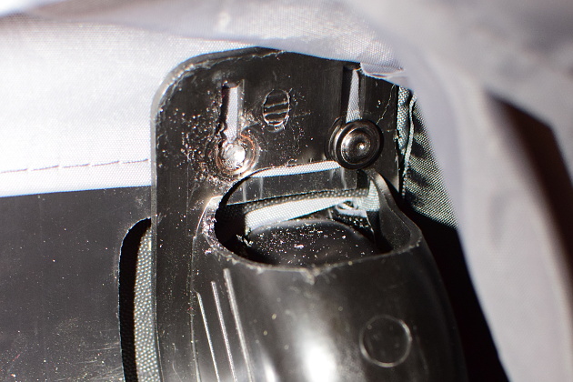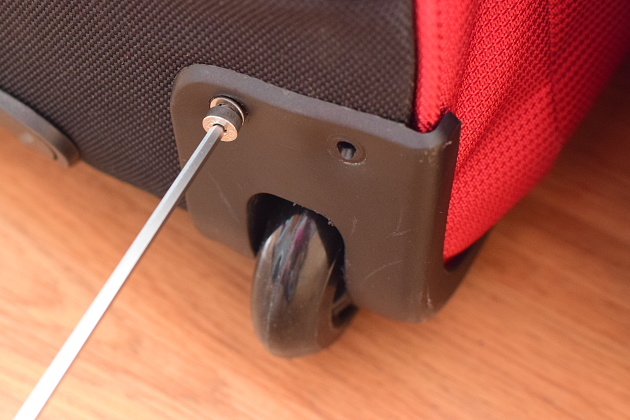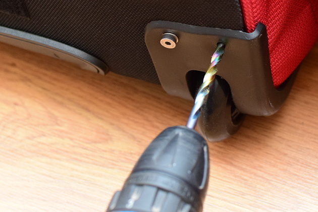 Postup budeme ilustrovat na opravě kufru značky High Sierra. Postup lze však opakovat i pro jiné značky kufrů. Aby bylo možné vložit a utáhnout osičku nového kolečka, bylo třeba vymontovat celé uchycení kolečka, které však bylo přinýtované.