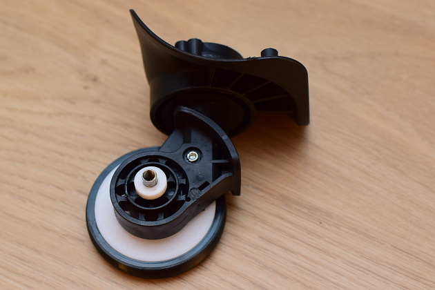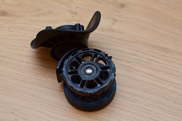 Plastový držák dvojitého kolečka je připevněn na kovovém montážním trnu a zajištěn nýtkem nebo kolíkem. Kolík či nýtek může být viditelný nebo schovaný za kolečkem. Držák může být poškozen či ztracen. Naštěstí i takto rozbitý kufr lze opravit.