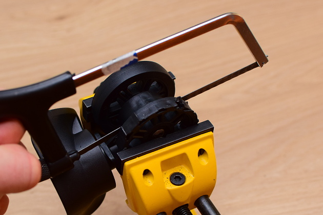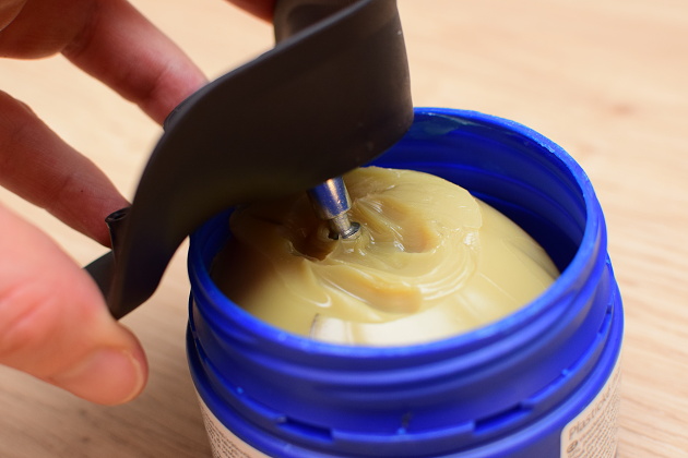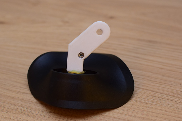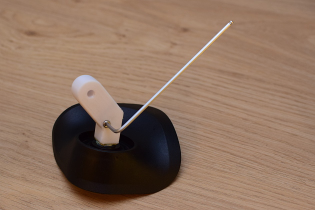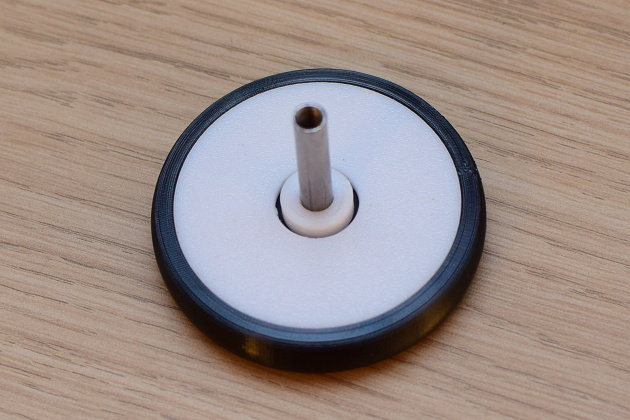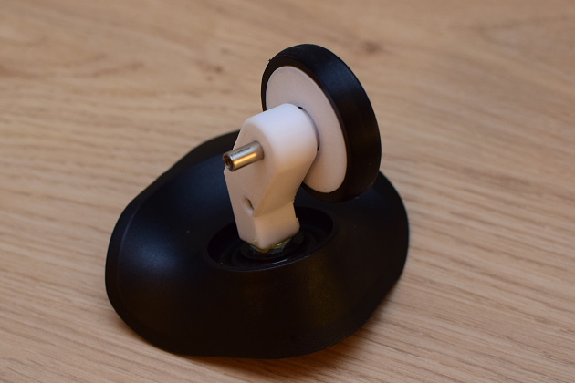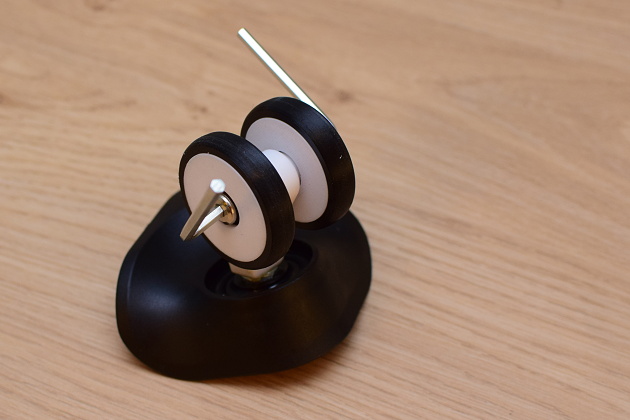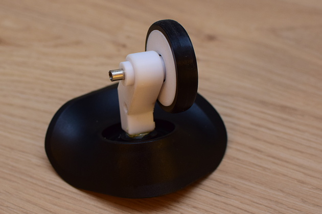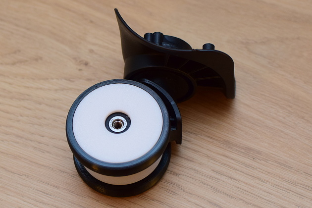 Trn namažeme vazelínou a nasuneme na něj nový držák. Vyzkoušíme, že se může volně otáčet a zajistíme jej na trnu šroubkem. Můžeme pokračovat montáží koleček.