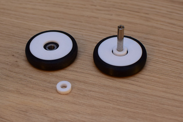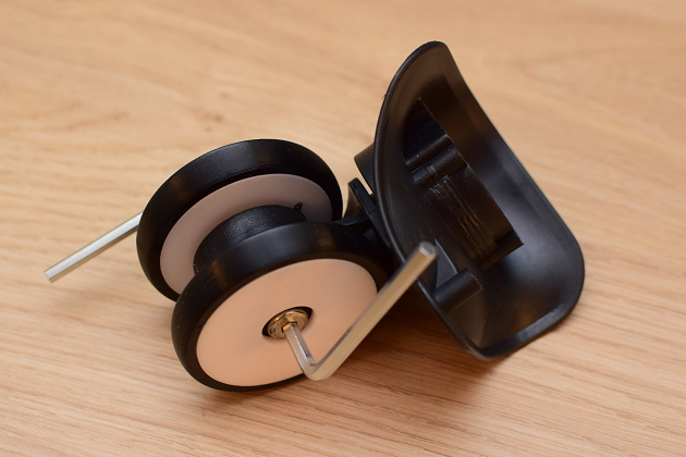 Na osičku nasuneme jedno kolečko a distanční podložku. Pak kolečko zasuneme do držáku a z druhé strany nasuneme druhou distanční podložku, druhé kolečko a zašroubujeme osičku.