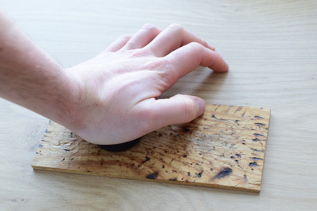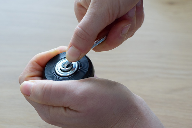 Po vložení obou ložisek uchopíme střed ložisek mezi palec a ukazováček a zkusíme kolečem pojezdit po stole. Přitom zkontrolujeme, že se kolečko dobře otáčí a nehází. Pokud kolečko hází, překontrolujeme usazení ložisek a případně je dorovnáme.